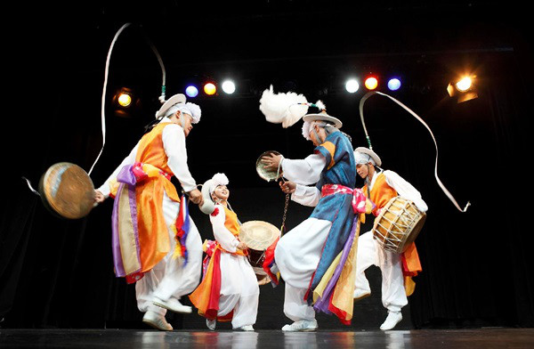 корейское представление в традиционном стиле, игра на национальных ударных инструментах.